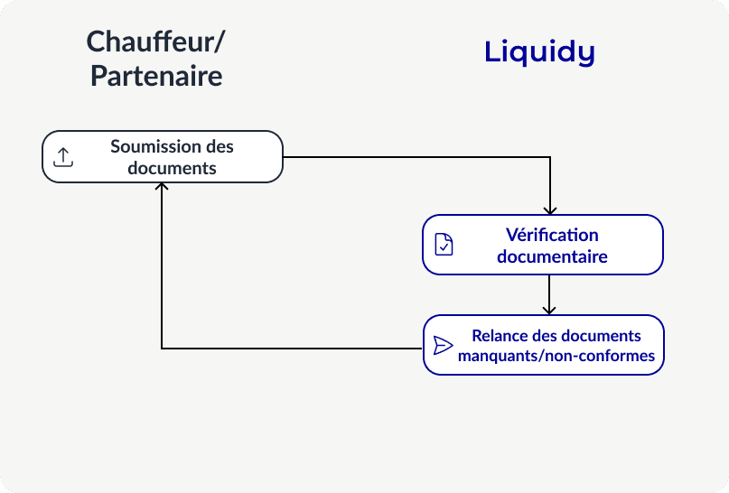 Liquidy opère directement dans vos outils pour vérifier les documents chauffeurs, partenaires et véhicules.